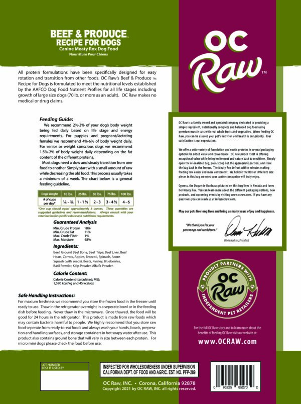 For maximum freshness we recommend you always store this product in the freezer until ready to use. Meaty Rox will thaw relatively quickly and should be thawed in the refrigerator NEVER in the microwave. This product is made from raw meat, raw animal ingredients, raw fruits, and raw veggies intended for human consumption and may contain bacteria harmful to people. We highly recommend you store this product separate from ready to eat foods and always wash your hands, bowls, and handling surfaces with hot soapy water after use. This product also contains ground bone which can vary in size from batch to batch. The use of stainless-steel bowls is recommended over plastic products.