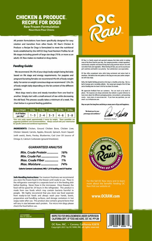 Transitioning to a new food varies from pet to pet. What works for one may not work for another. Those with hearty digestive systems can transition quicker, even cold turkey without any significant side effects. While other dogs benefit and may require a slow and steady transition from ranging from a few days to several weeks. Simply start with a small amount of OC Raw to your current food and every day or every few days increase the amount of OC Raw while decreasing the old food.