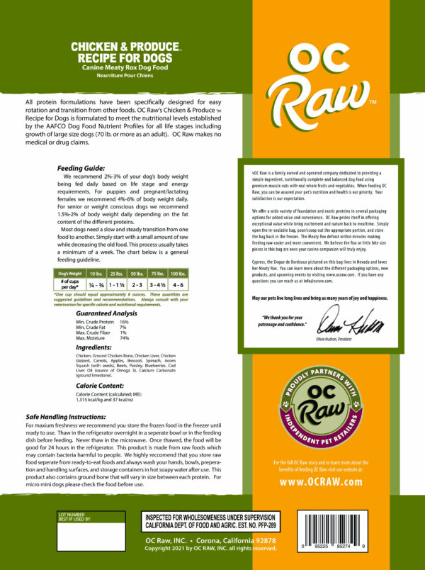 Transitioning to a new food varies from pet to pet. What works for one may not work for another. Those with hearty digestive systems can transition quicker, even cold turkey without any significant side effects. While other dogs benefit and may require a slow and steady transition from ranging from a few days to several weeks. Simply start with a small amount of OC Raw to your current food and every day or every few days increase the amount of OC Raw while decreasing the old food.