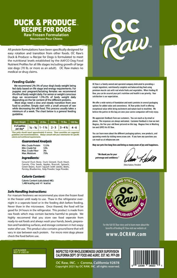 Ducks are raised without hormones or antibiotics. The birds are grown, raised, and processed in the USA and Europe. We use approximately 90% animal content. The animal based ingredients consist of premium muscle cuts so the meat to bone ratio is smaller while protein content derived from animal muscle meat is higher compared to other commercial raw brands who claim 95/5. Purpose: alternative poultry option with higher fat content.