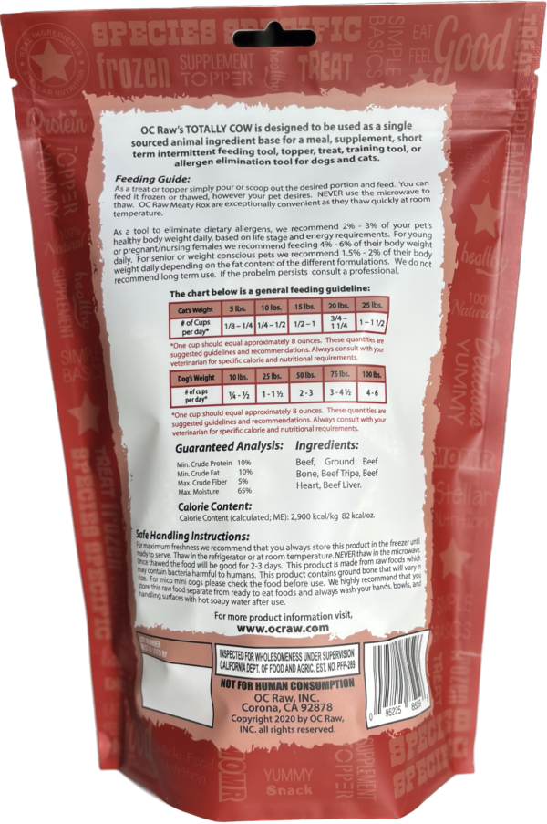 Totally Cow is made from the same beef ingredients compared to the food with fruits and vegetables. Simply a meat only ground product with bone and organ content. USA grown raised and processed cows without added hormones and antibiotics. Mainly sourced from California and Midwest Farms. Our Totally Cow is our same beef ingredients without the fruits, vegetables and supplements. This is not intended for daily feeding but supplemental feeding, treat, topper, mix in, or used as a short term detox or elimination tool to help determine source of allergy.