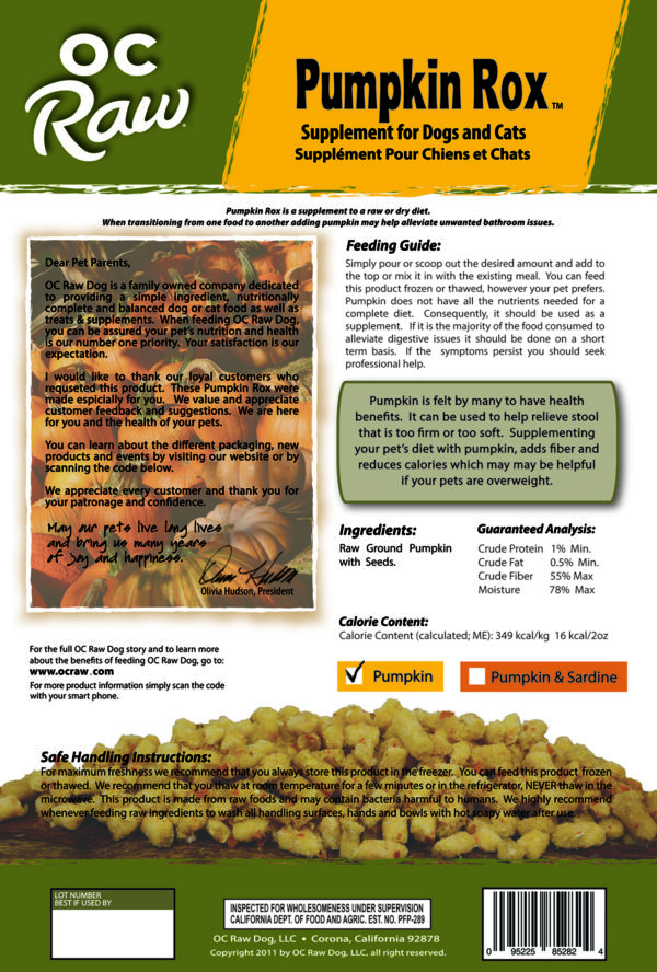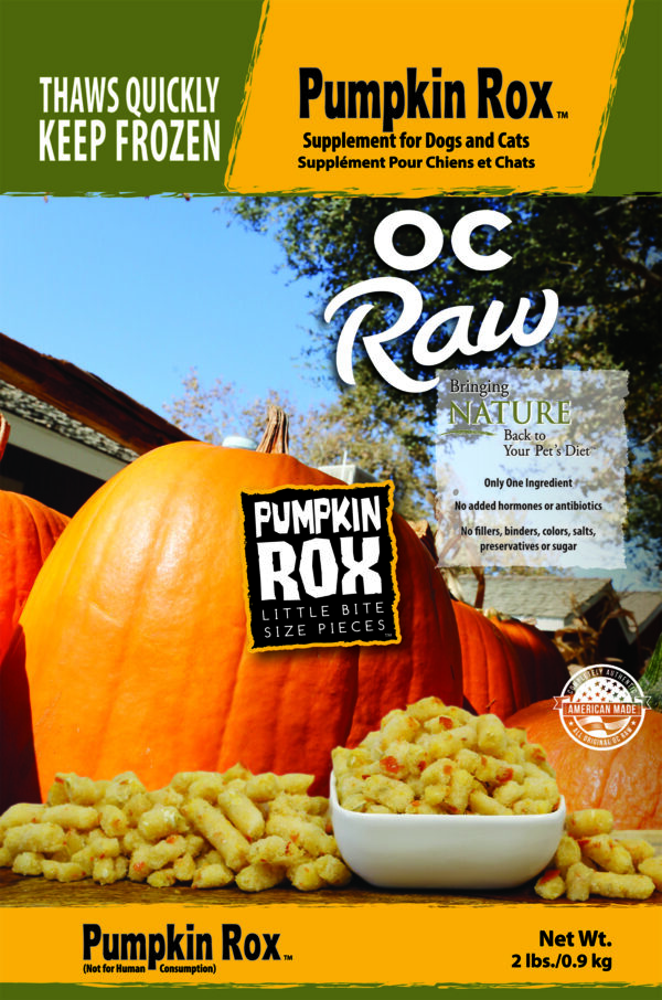 The frozen Pumpkin Rox were designed with the intention of a digestive aid. Using whole ground pumpkin versus the canned pumpkin you may see in some retailers to aid in the digestion and transitioning from one food to another. Pumpkin has the unique ability to firm up stools that may be too loose in addition to help move ‘things’ along with the stools may be too firm.