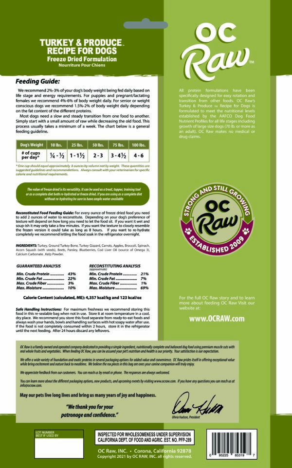 Transitioning to a new food varies from pet to pet. What works for one may not work for another. Those with hearty digestive systems can transition quicker, even cold / freeze dried turkey without any significant side effects. While other dogs benefit and may require a slow, steady transition ranging from a few days to several weeks. Simply start with a small amount of OC Raw to your current food and every day or every few days increase the amount of OC Raw while decreasing the old food. The graphic below is represented using the Freeze Dried Meaty Rox.